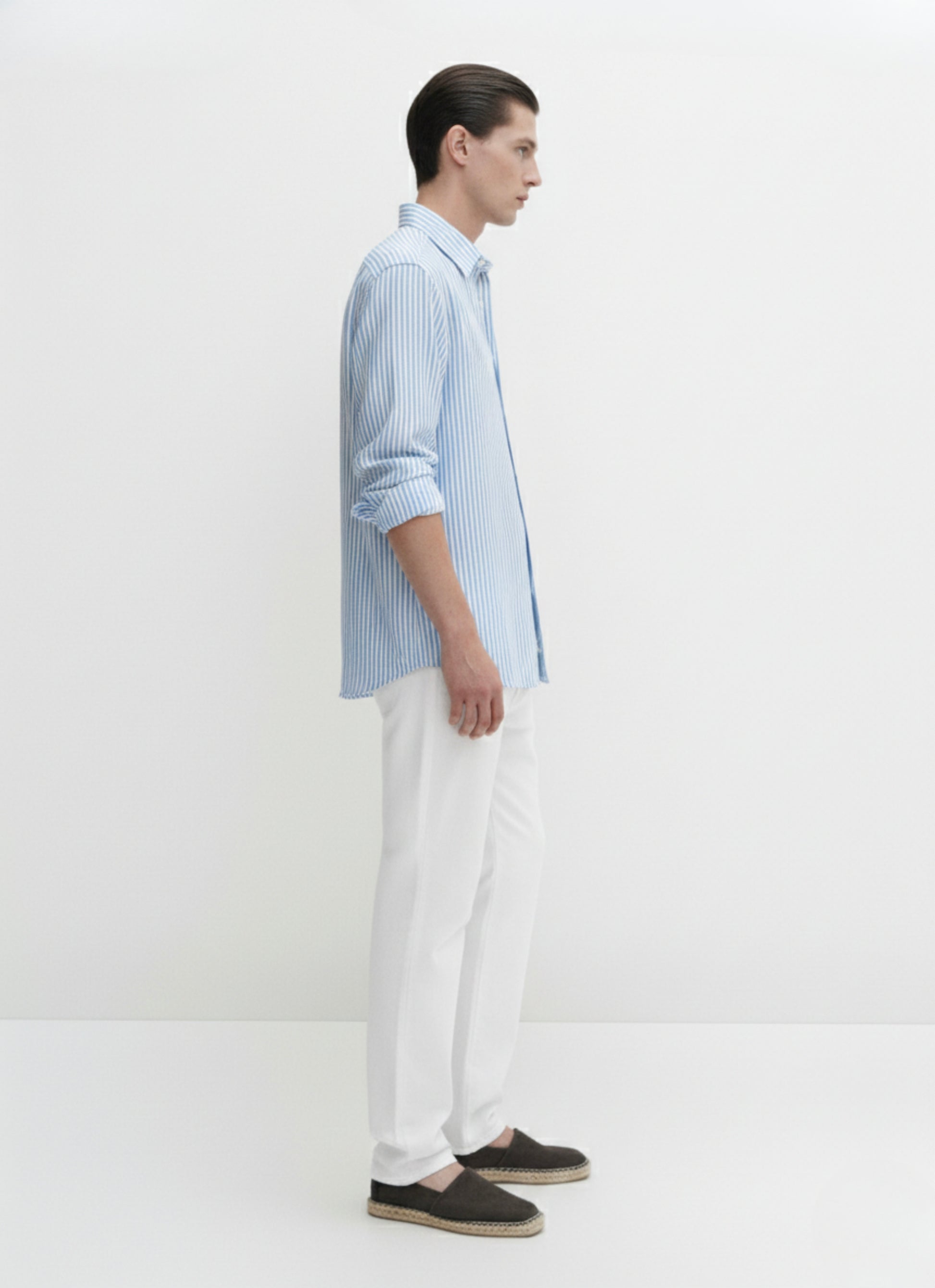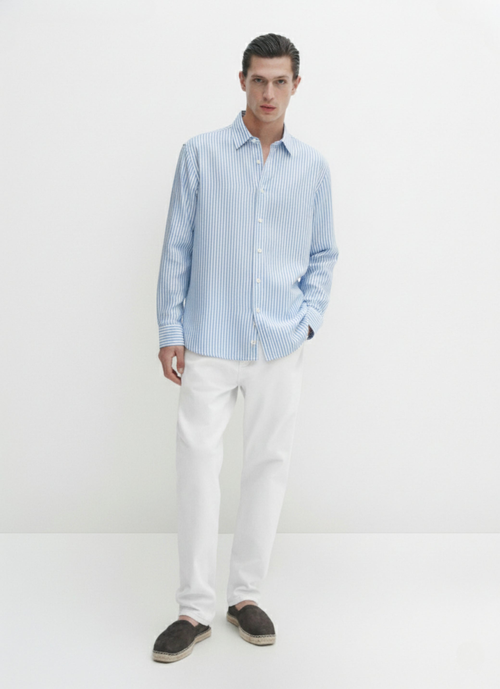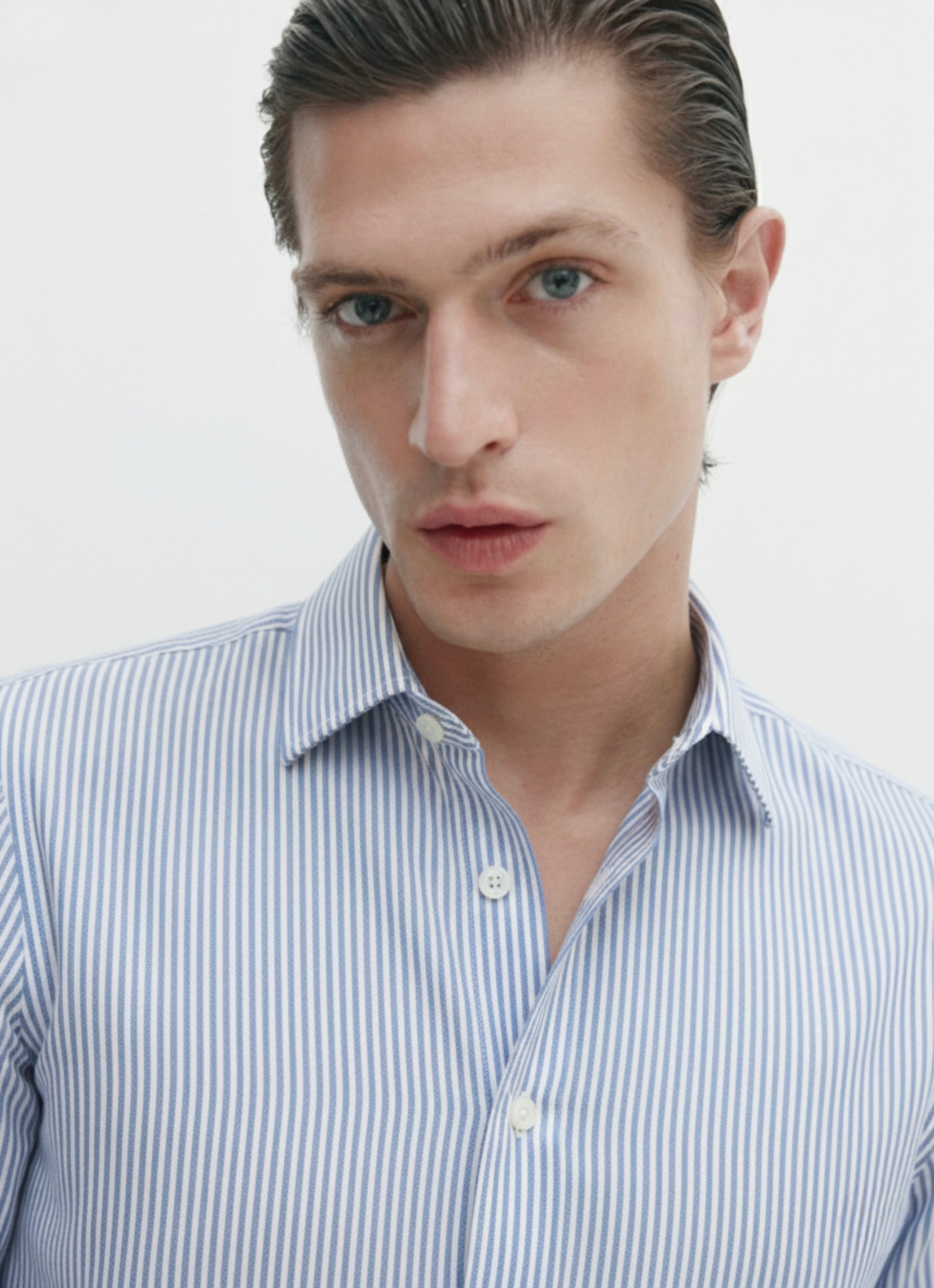 Classic button down stripped shirt in french placket. 100% cotton shirt woven from Blue and Stripped linen with a relaxed, sleek button-up and long sleeves. Add wide blue trousers for a sophisticated look.
