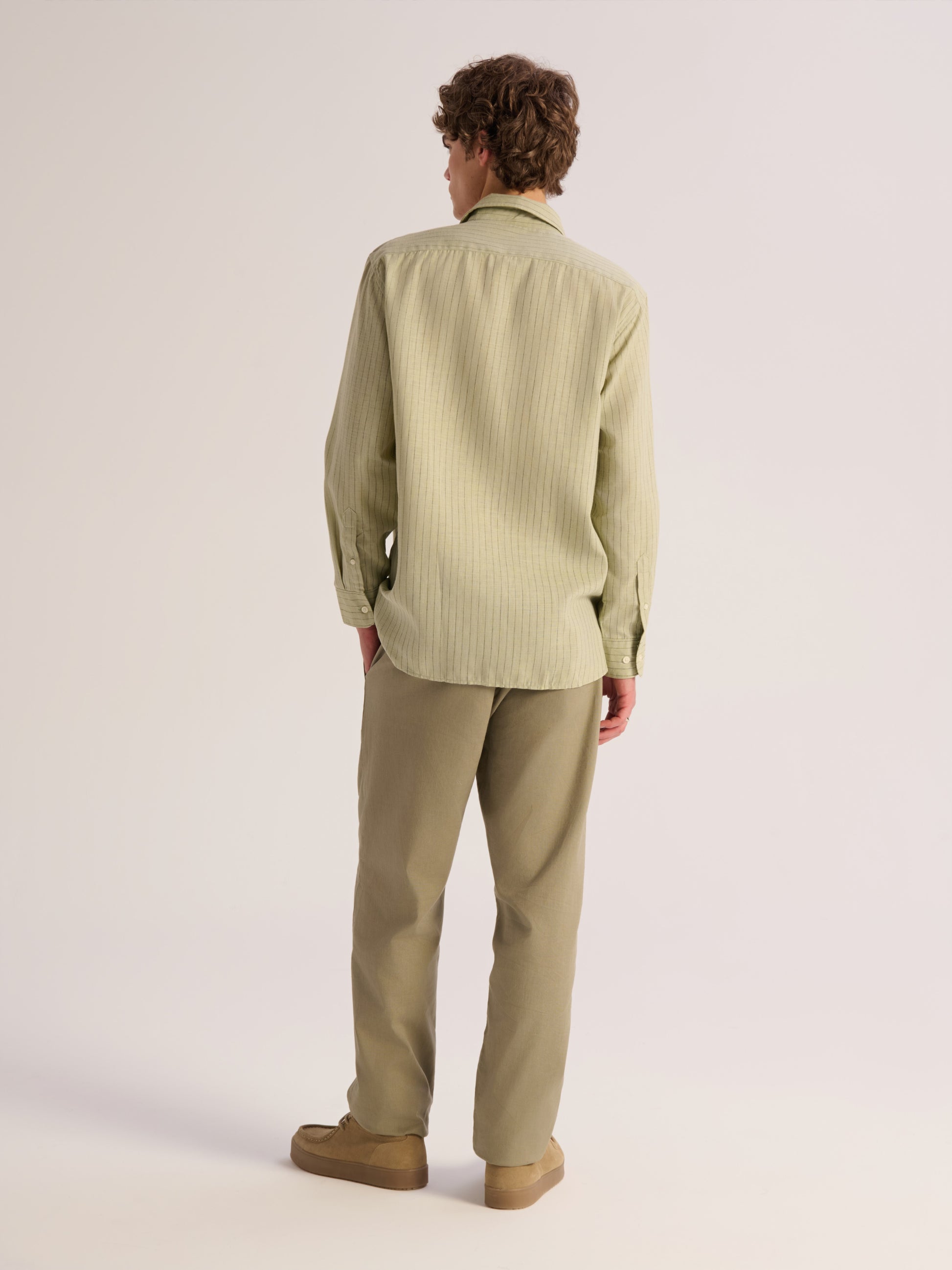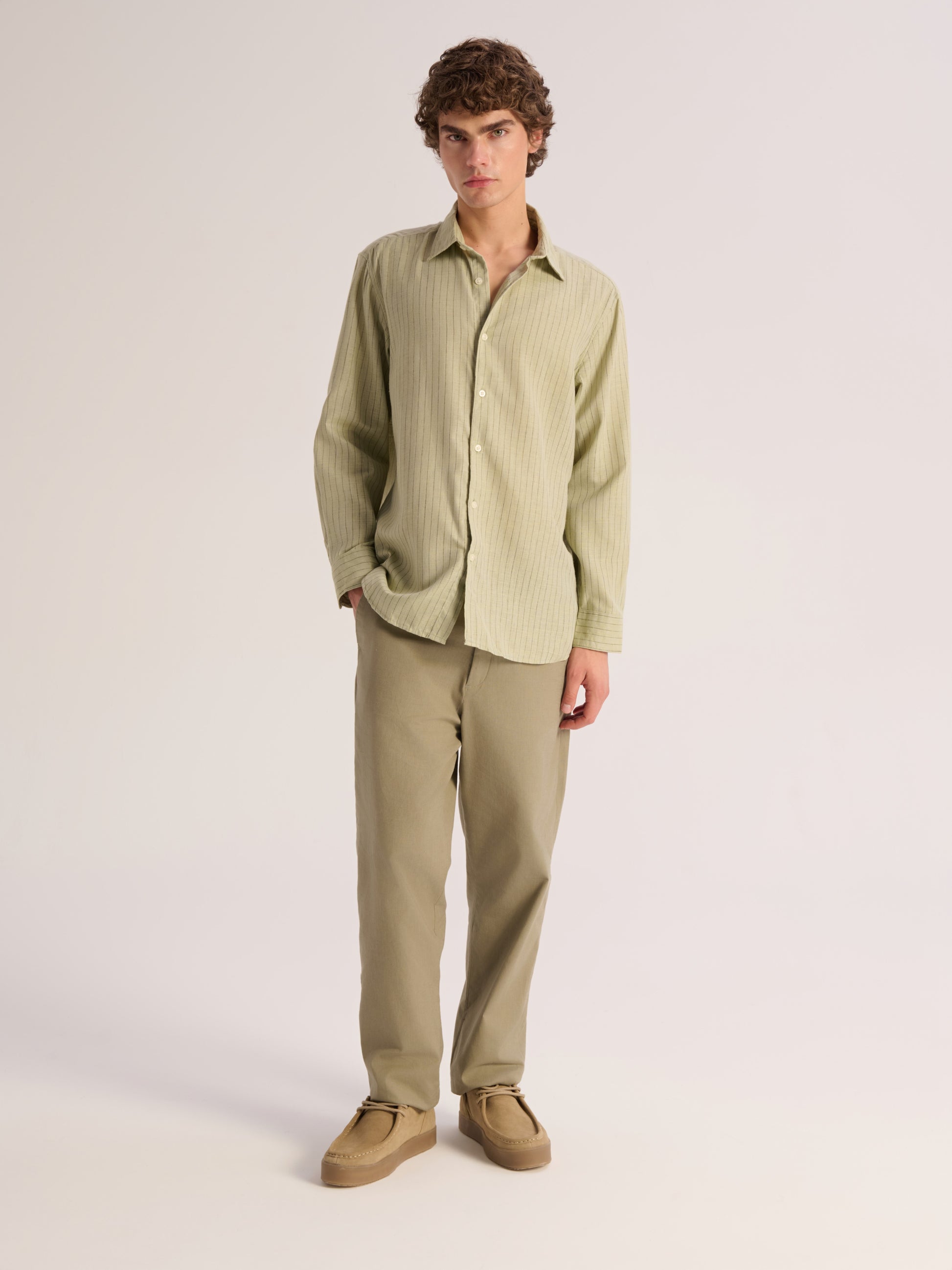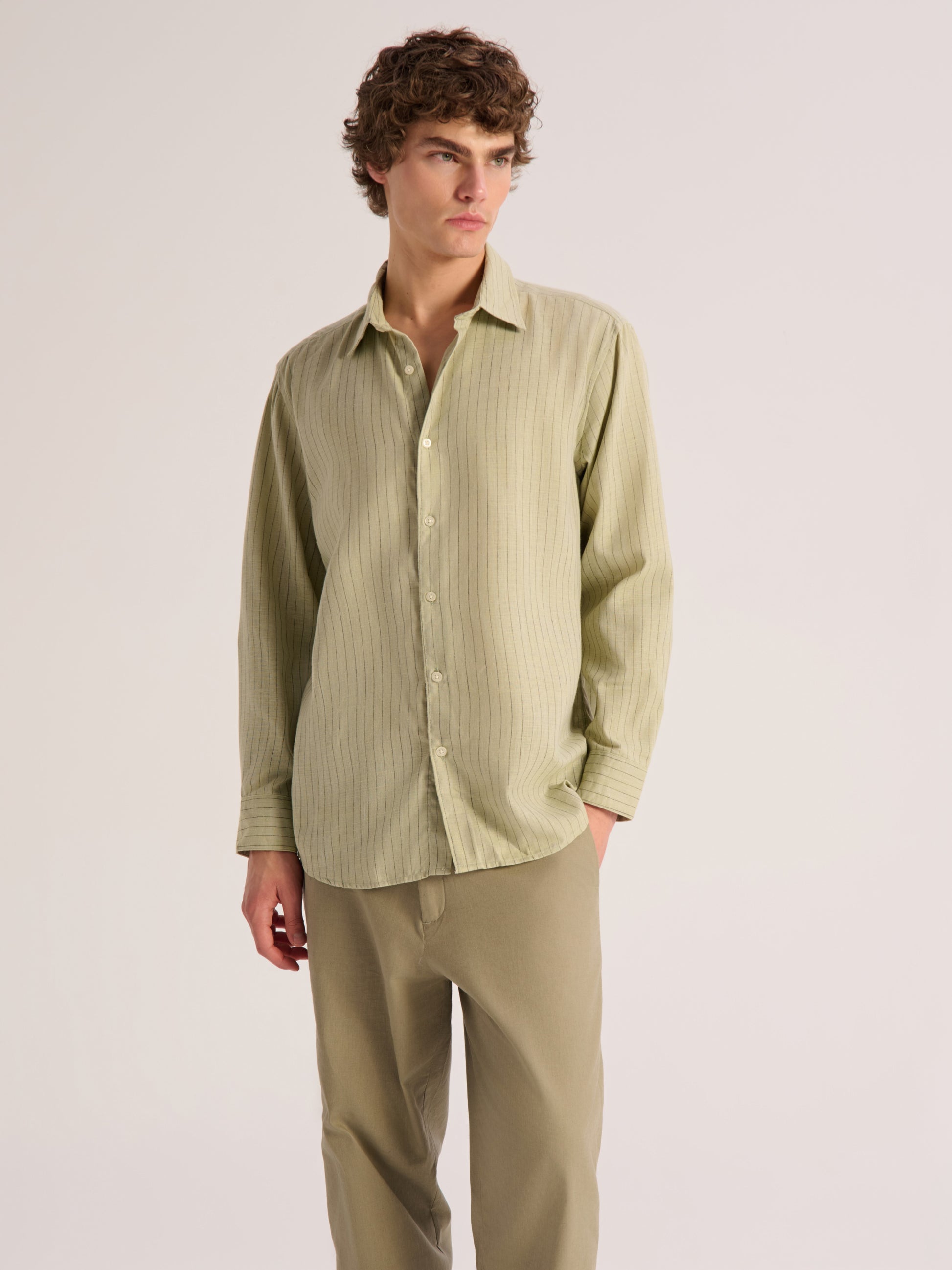 Shirt woven from green and black-striped cotton linen with YUR's signature regular fit, sleek button-up and long sleeves.