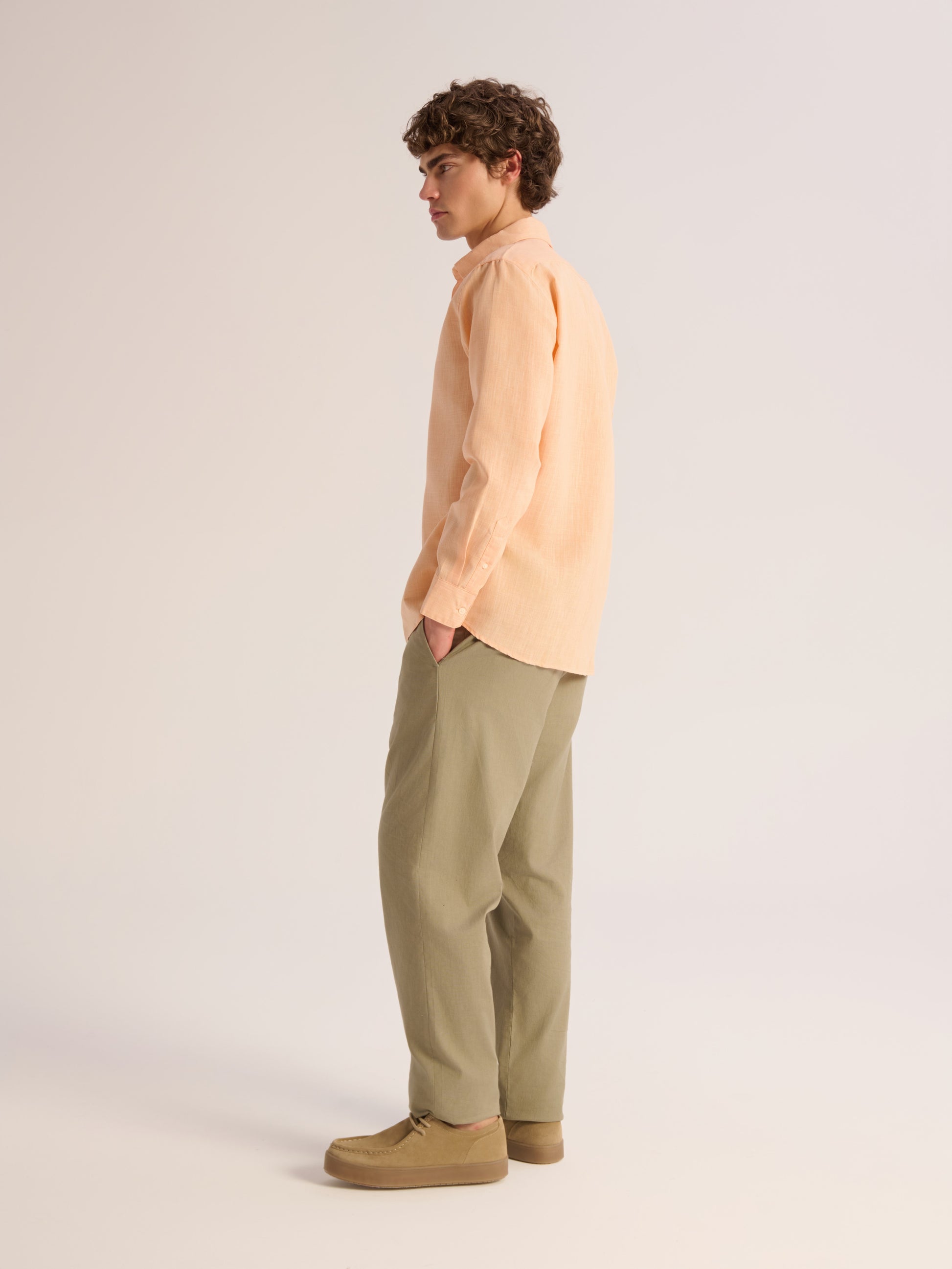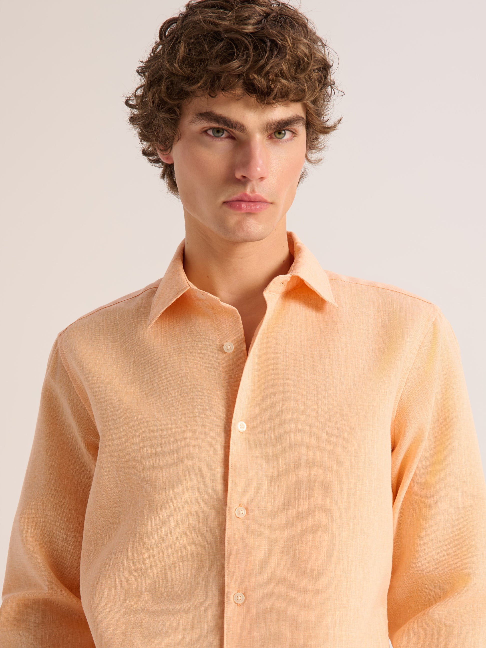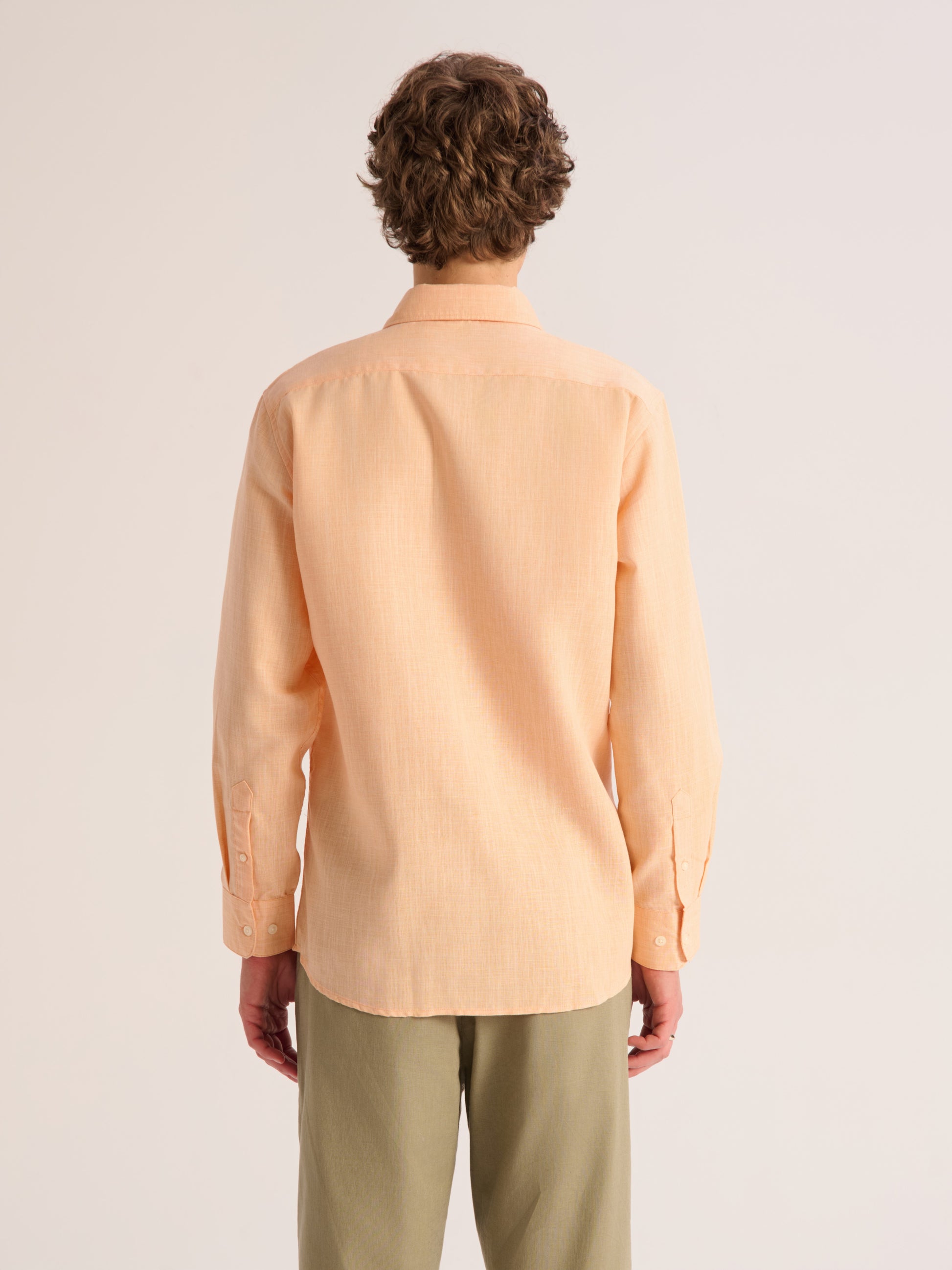 YUR 100% cotton shirt, undergoes a small-batch process, enhancing its softness and durability. Signature regular fit Linen shirt features a straight silhouette with long sleeves and buttoned cuffs. Offers extra room in the torso and arms