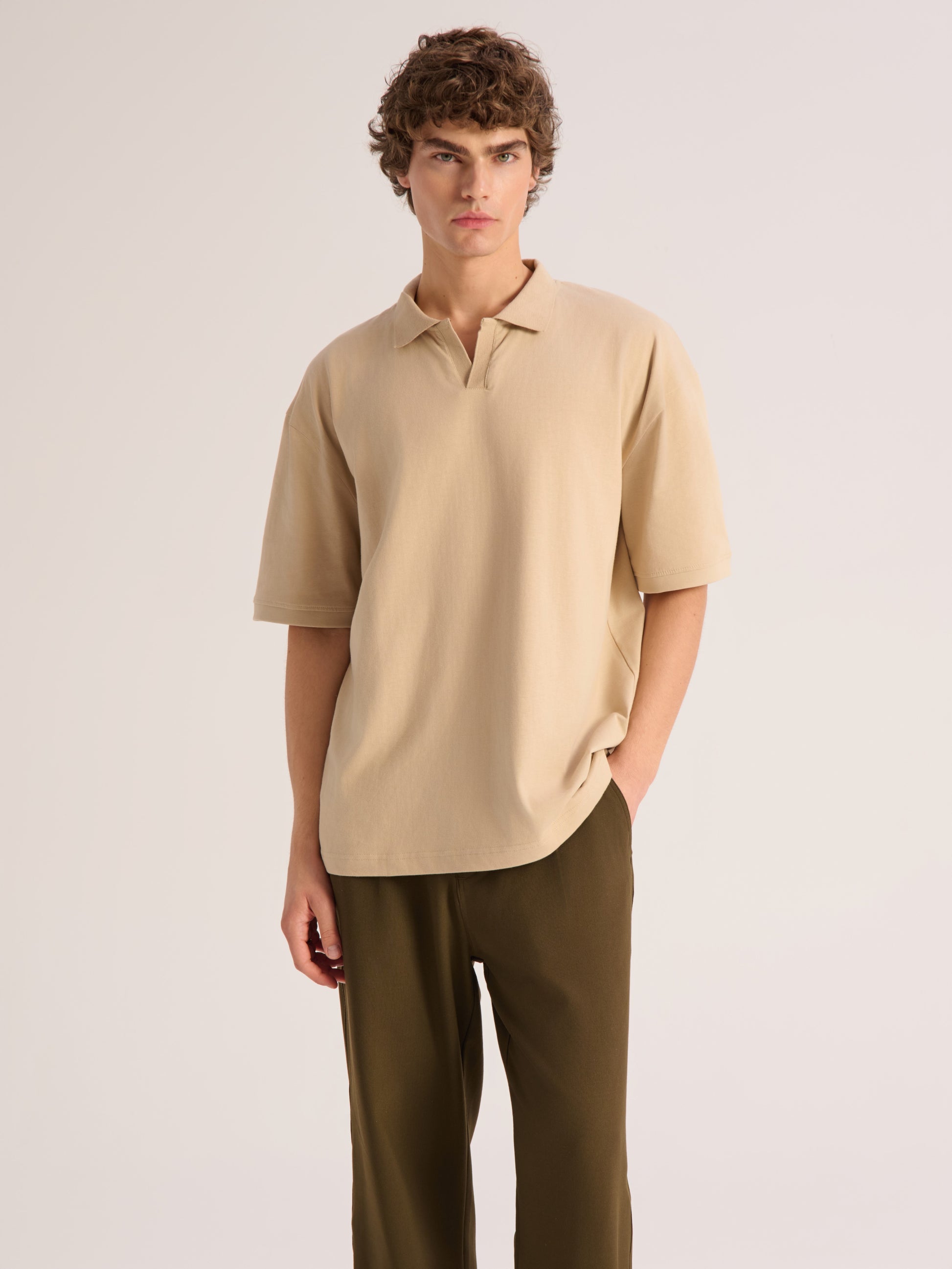 YUR knitted polo made of 100% cotton finished with ribbing at the neck and cuffs. Relaxed shape and soft hand feel. Add a shirt on top completing a casual evening, with the polo tucked in.
