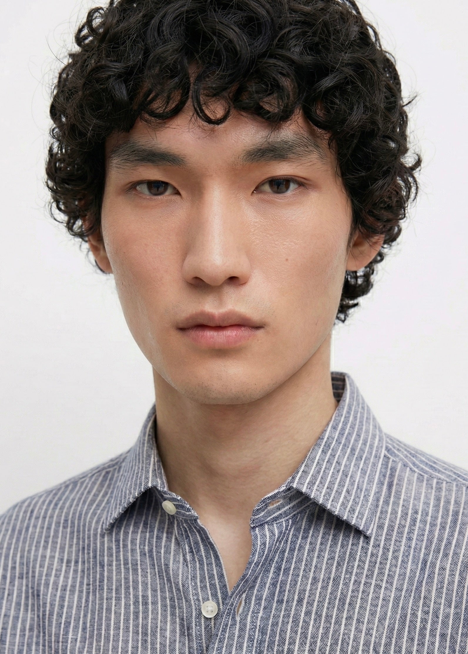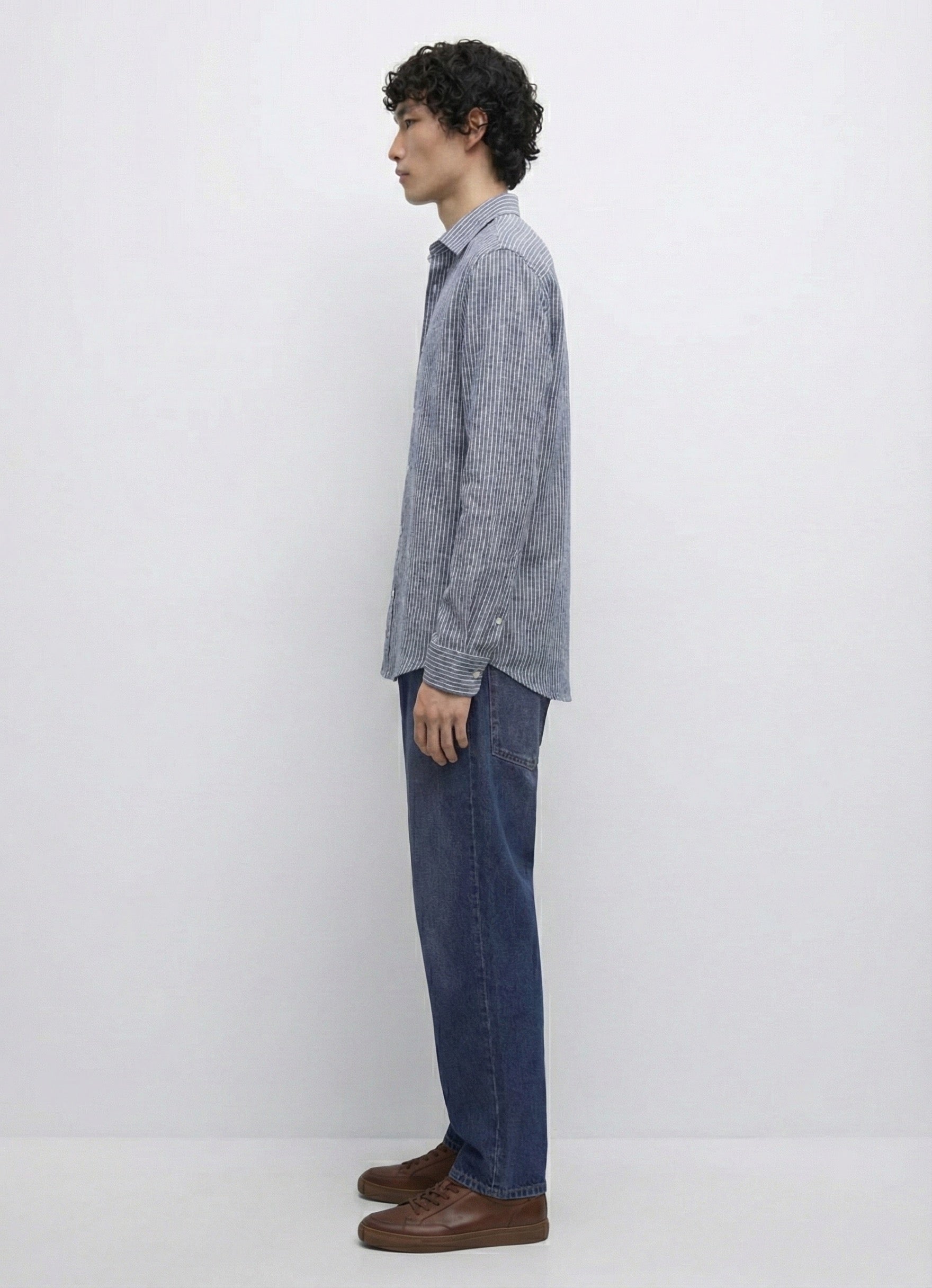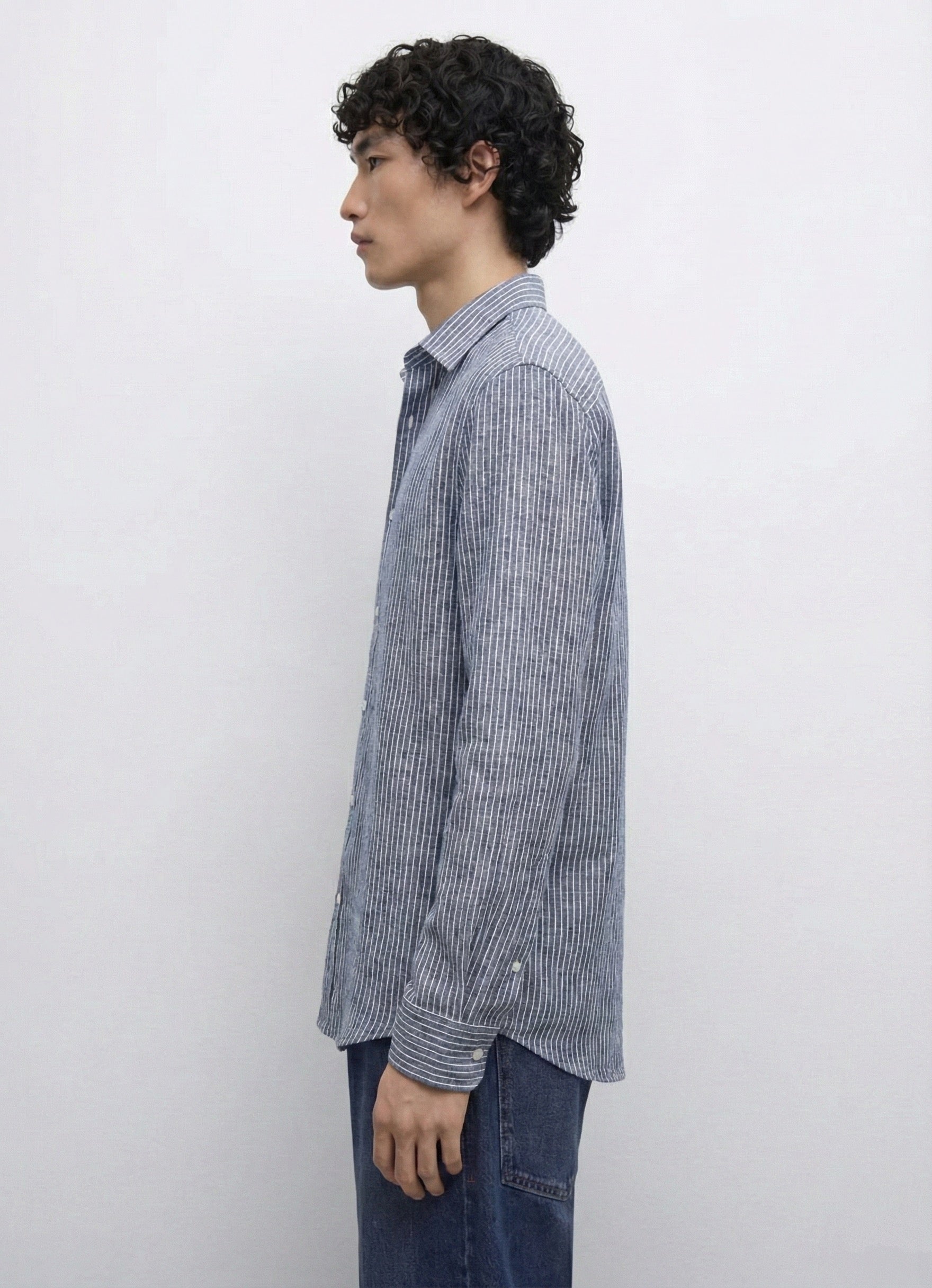 A relaxed pin-striped shirt with a French placket and curved hem. Looks best with darker bottoms.