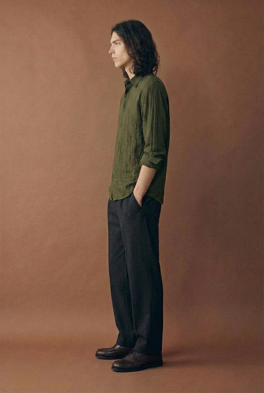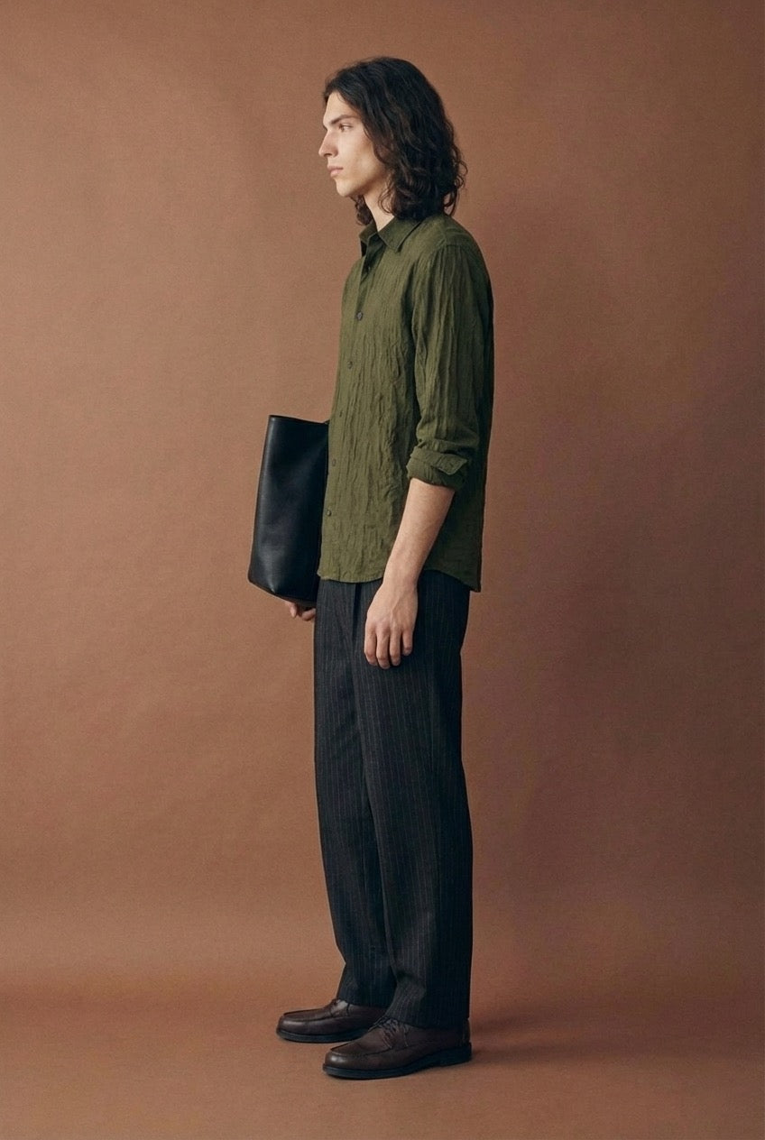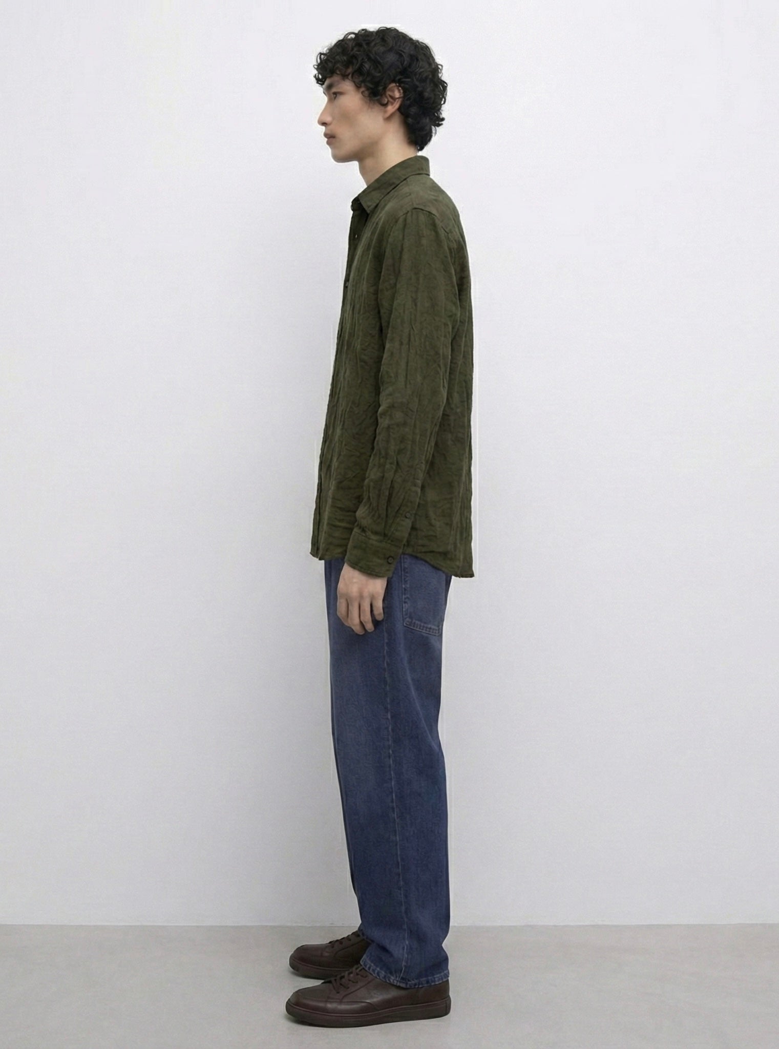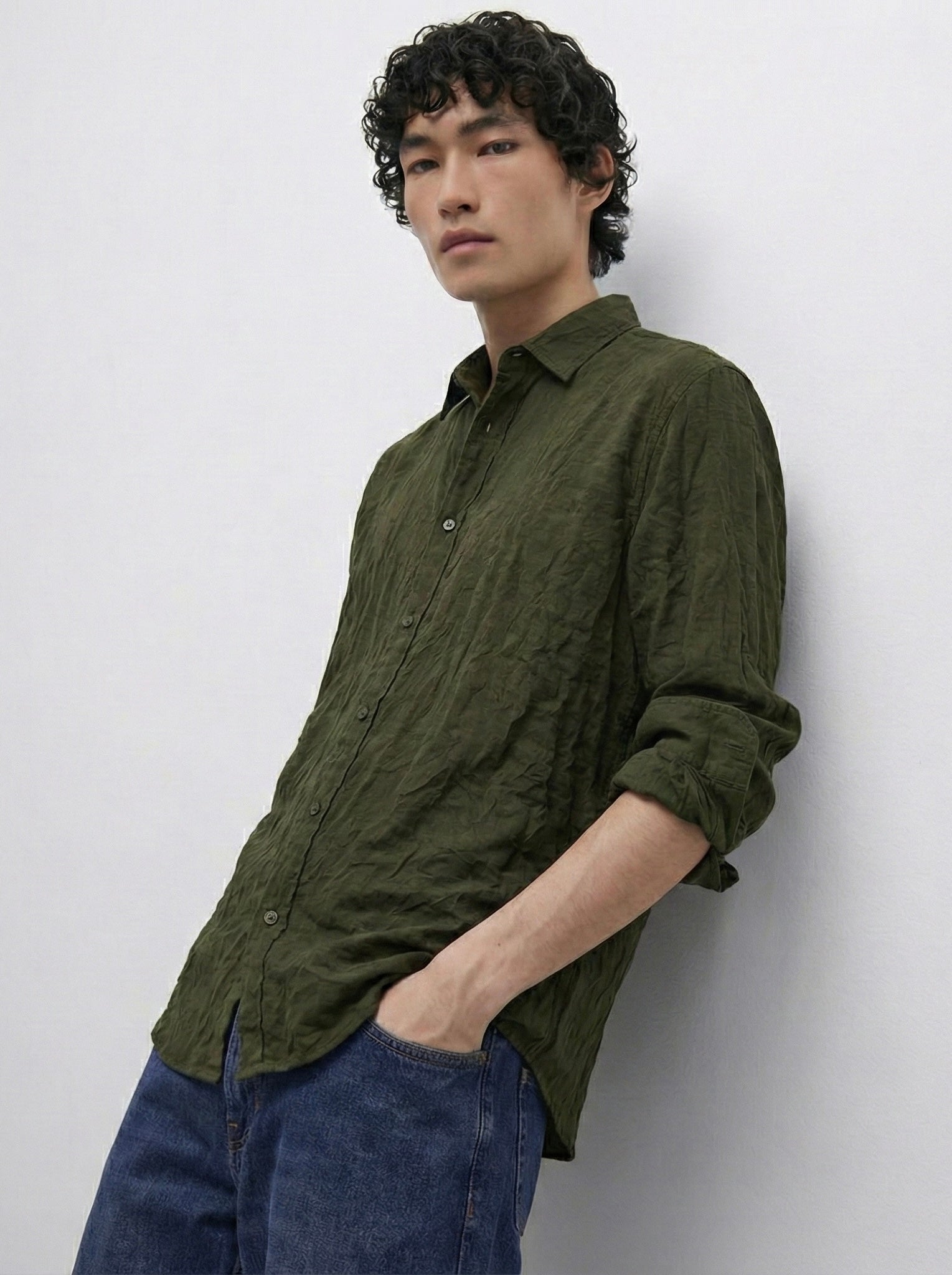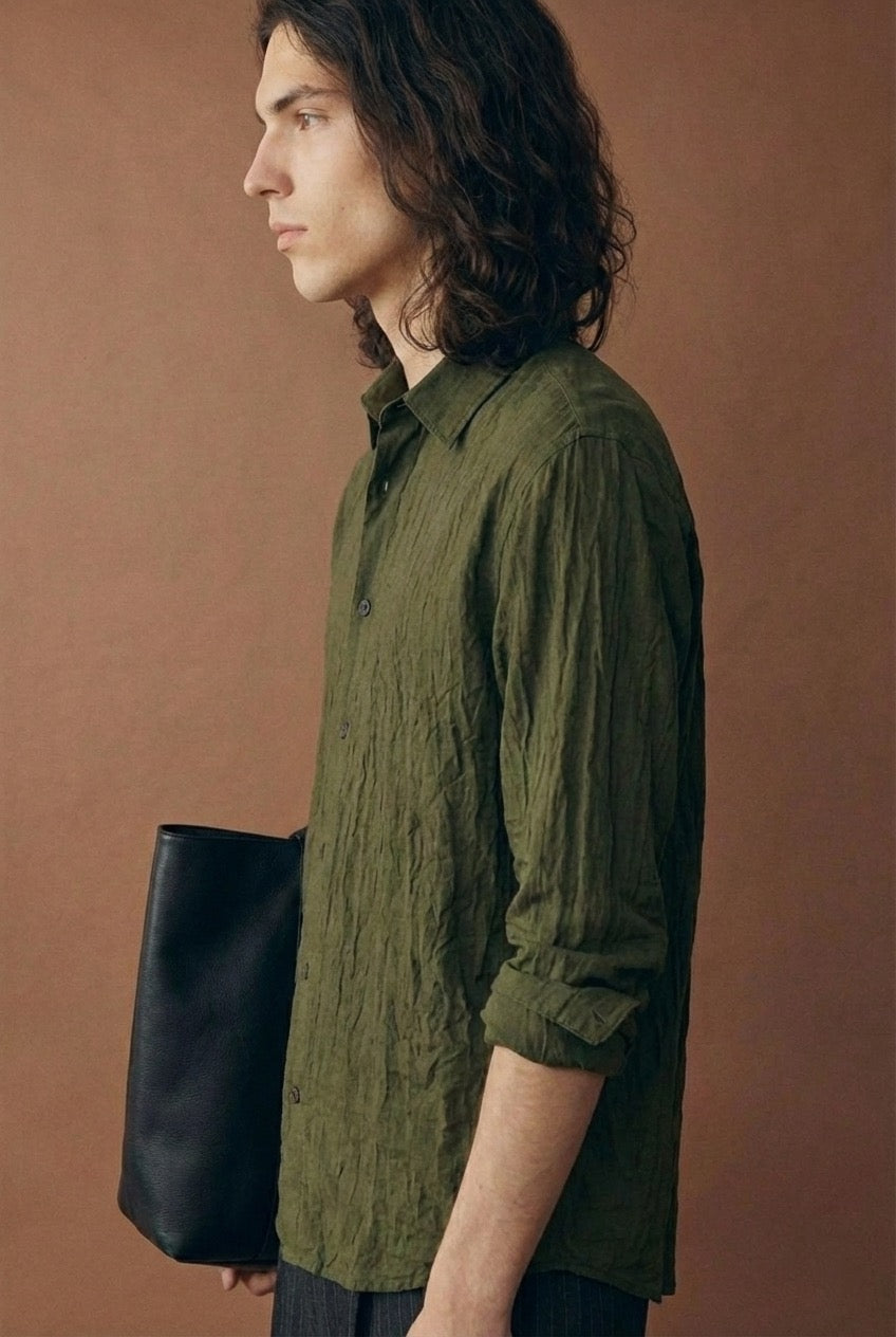 A relaxed-fit textured viscose shirt in a deep forest green that feels calm and grounded. The fabric has a soft flow with a subtle texture you notice when you’re close. Finished with a clean French placket and a curved hem that sits easy on the body.