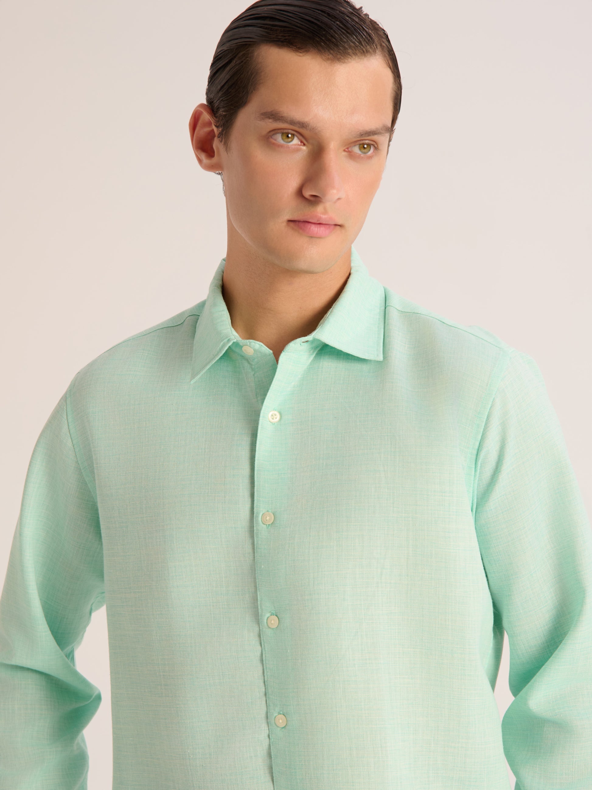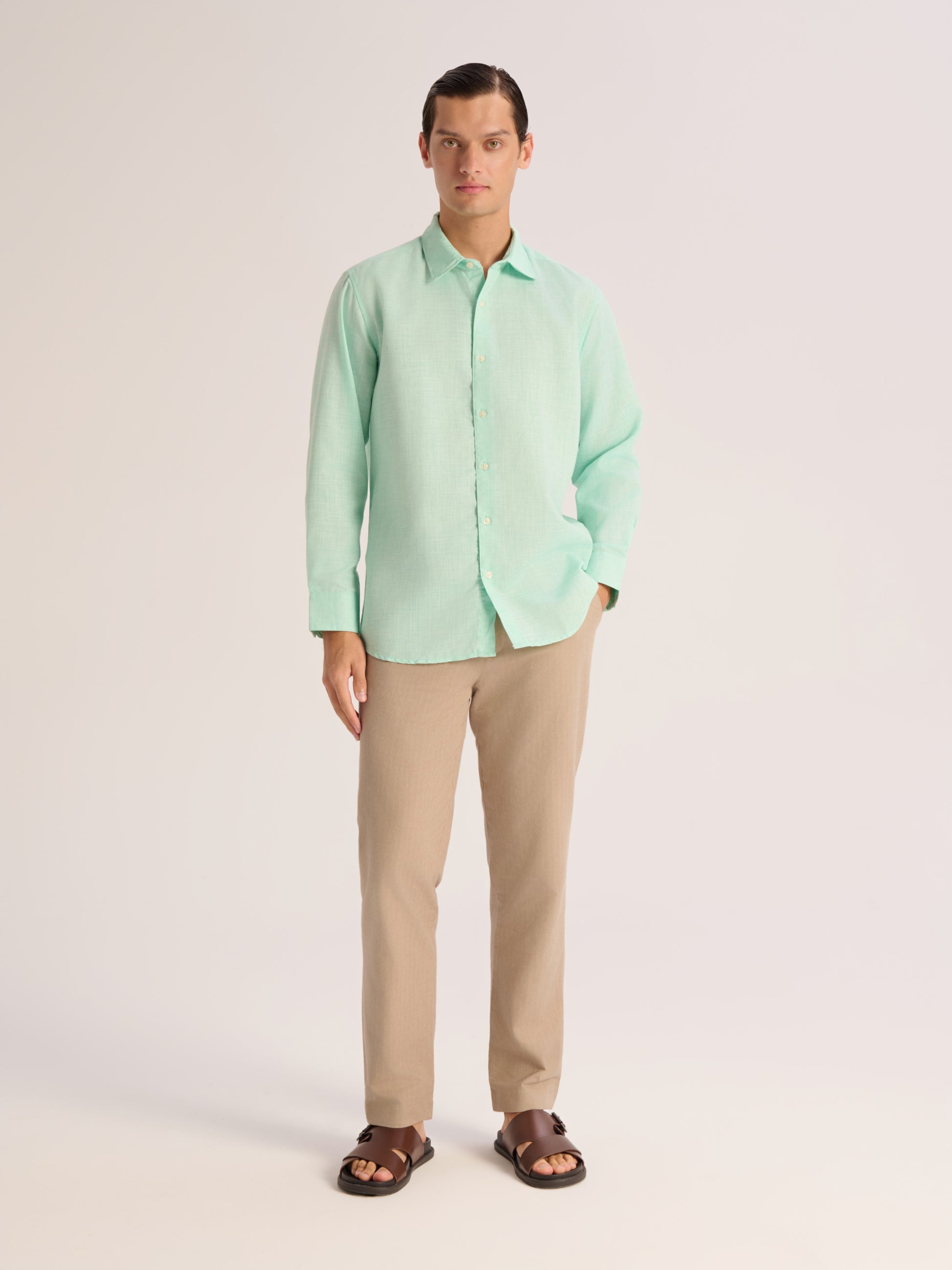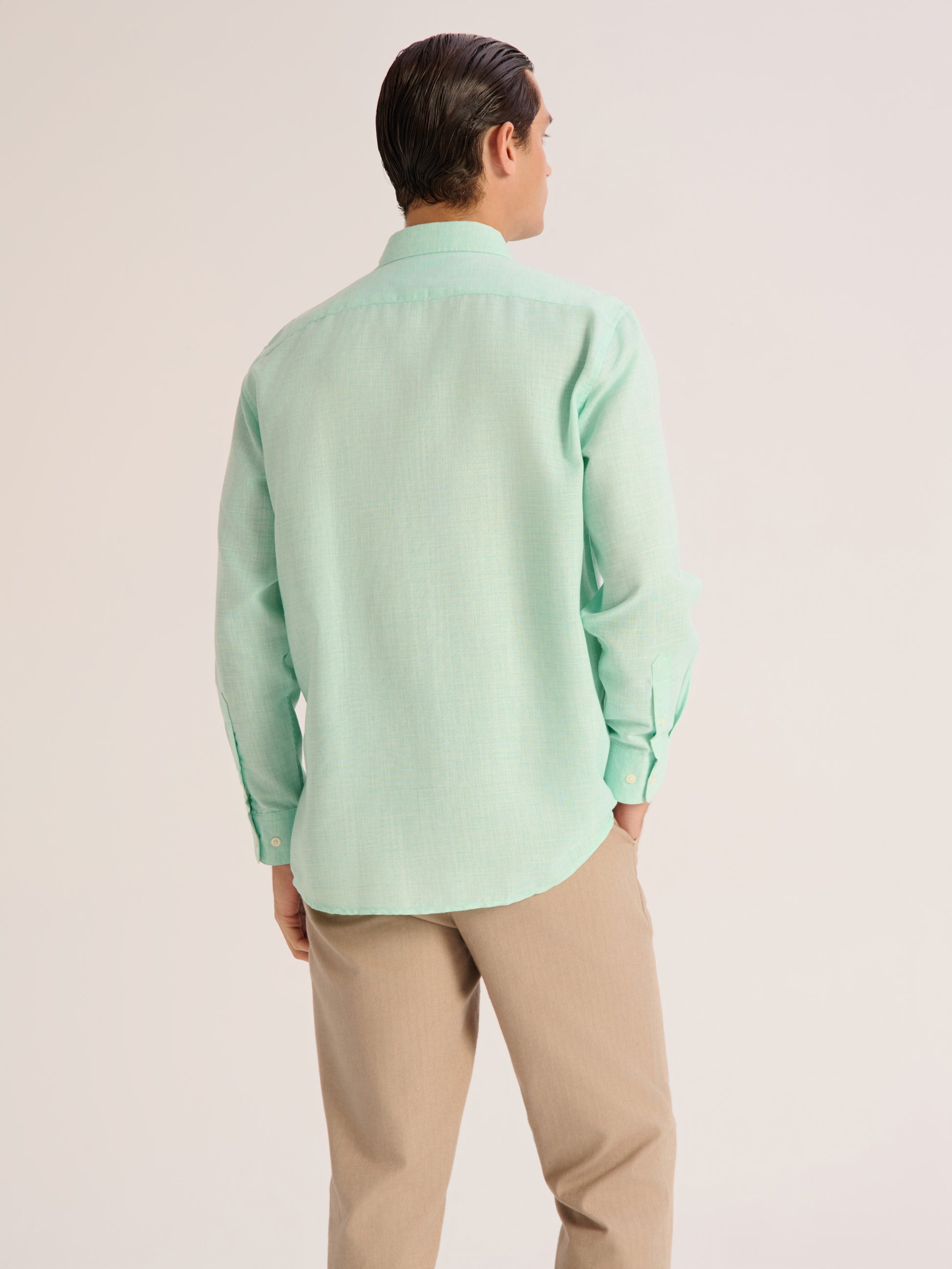 YUR 100% Cotton shirt, went through an Eco-conscious dying to maintain its structure and a natural flow. Regular fit, with french placket at front and curved hem, buttoned cuffs.